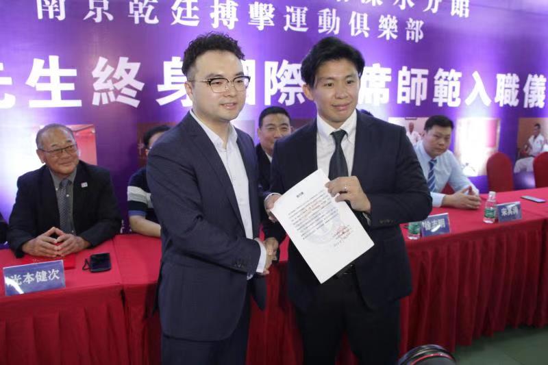 南京乾廷俱樂部總經(jīng)理夏廷暉為日本柔道教練頒發(fā)聘書