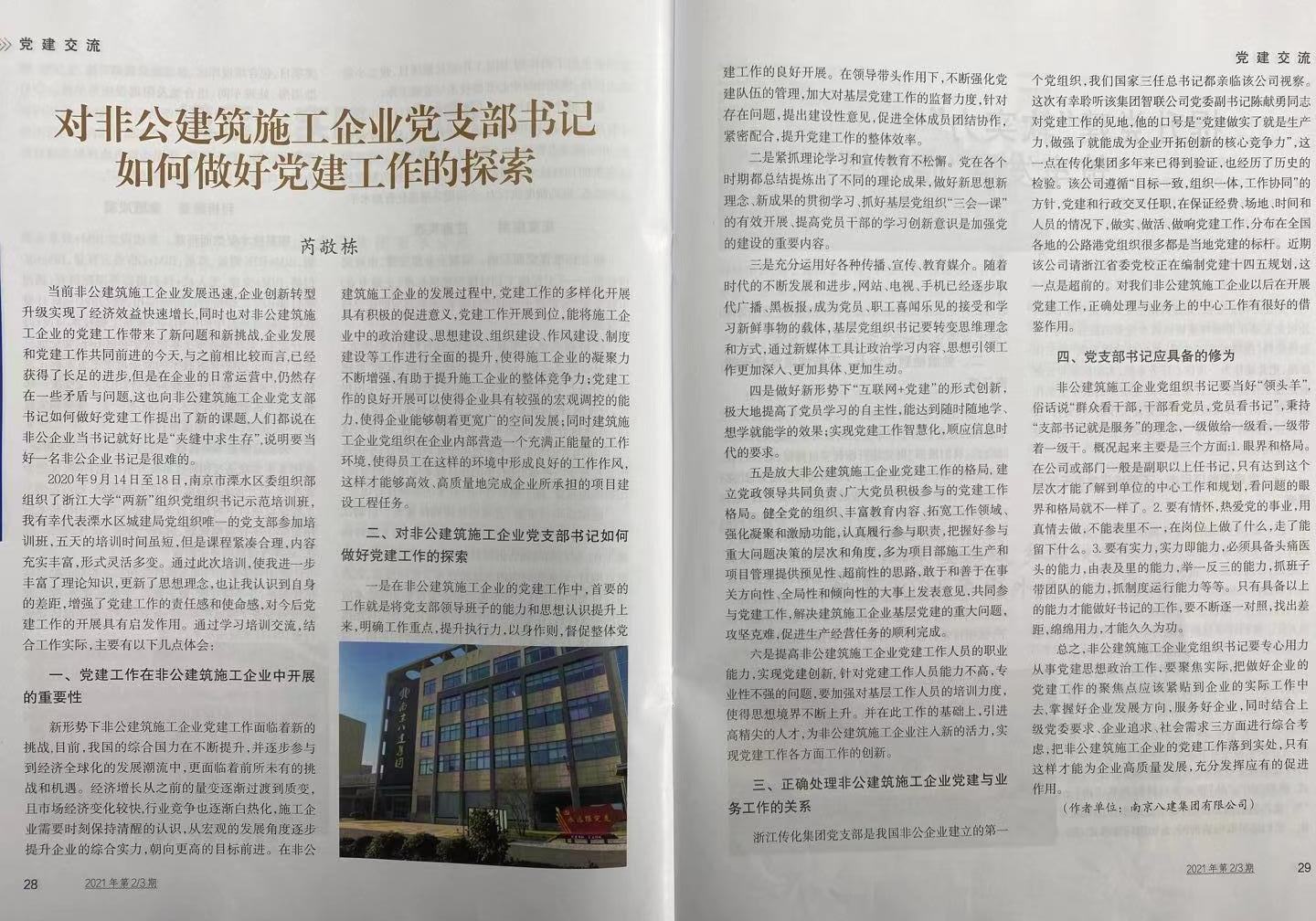 芮敬棟所寫《 對非公建筑施工企業(yè)黨支部書記 如何做好黨建工作的探索》刊登在2021.2/3《江蘇建筑業(yè)》上