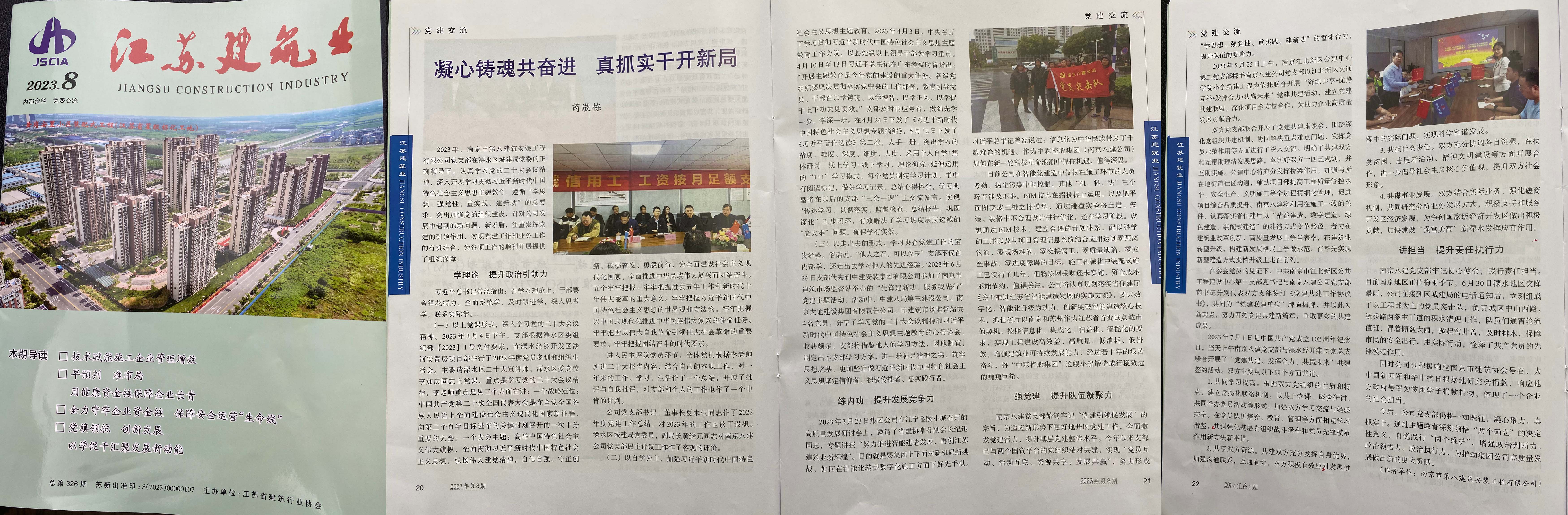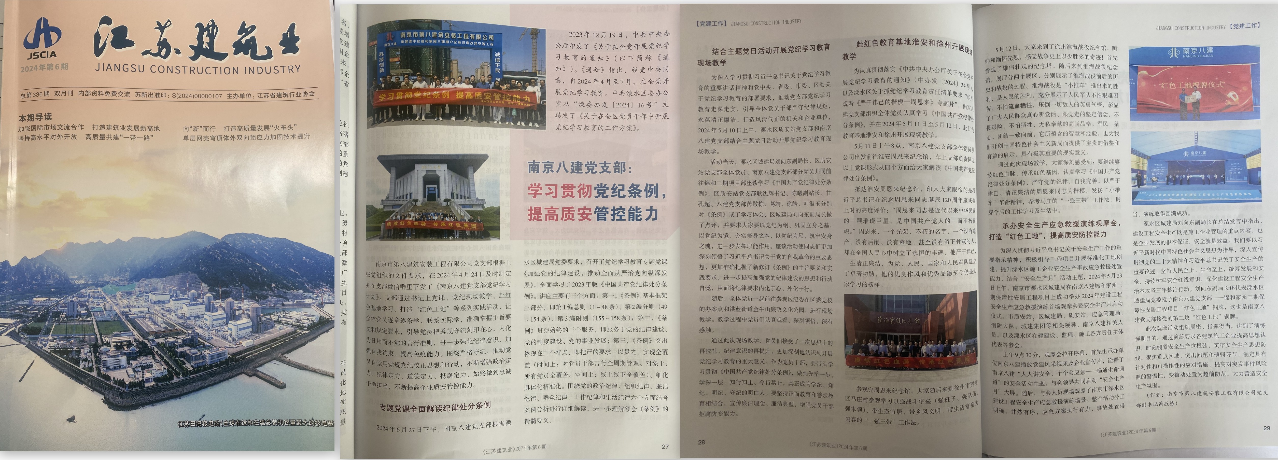 2024年6月,江蘇建筑業(yè)協(xié)會主辦的《江蘇建筑業(yè)》(2024年第6期)刊登了芮敬棟同志《南京八建黨支部:學(xué)習(xí)貫徹黨紀(jì)條例,提高質(zhì)安管控能力》一文